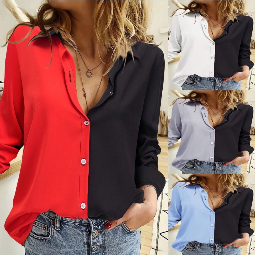 Patchwork Long-Sleeve Lapel Shirt With Single-Breasted Closure