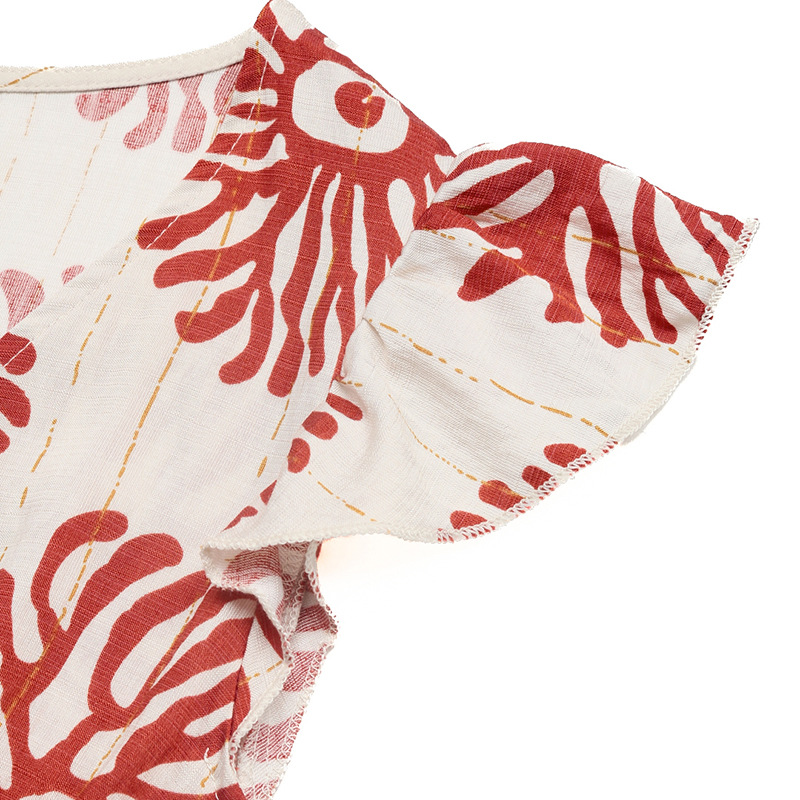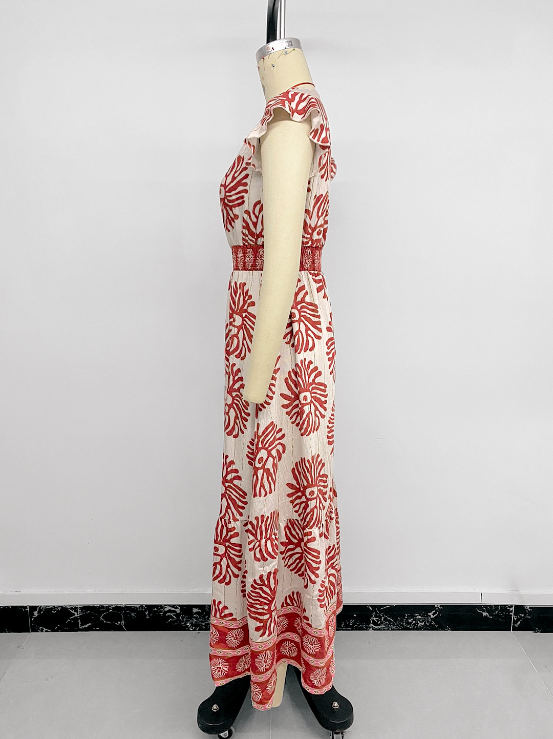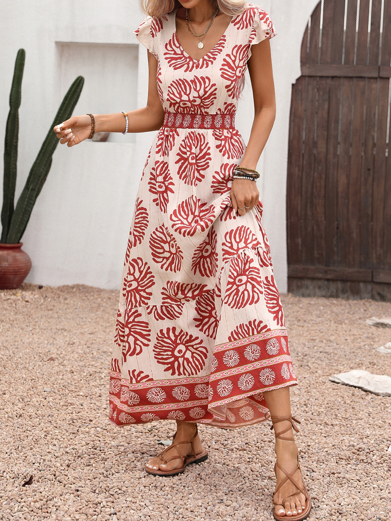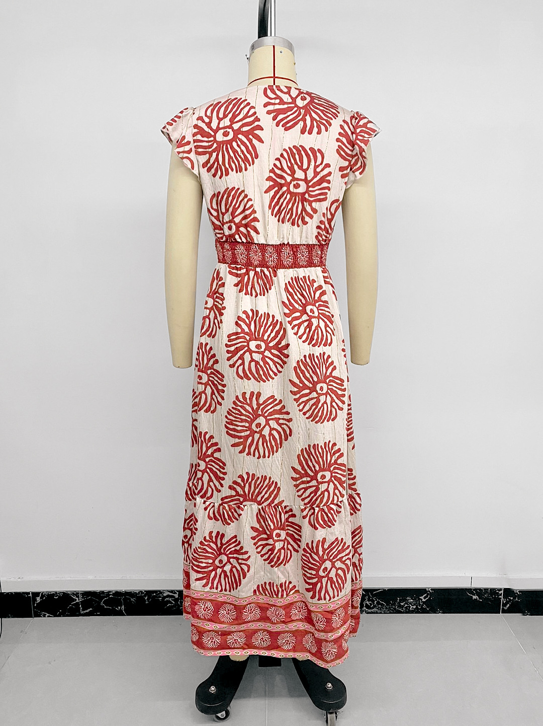 Womens Fit-and-Flare Long V-Neck Printed Dress